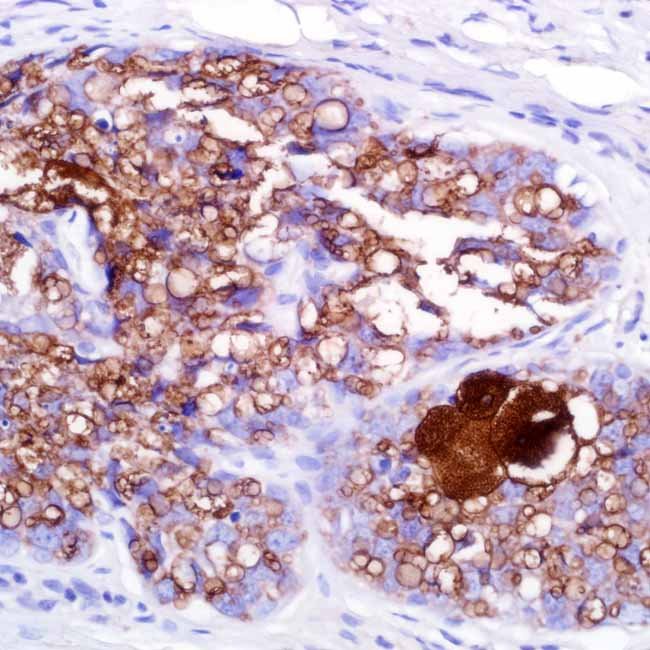 Anti-adipophilin targets the PLIN2 (perilipin 2) protein,which is a member of the perilipin family and is linked tointracellular lipid storage droplets and lipid globule surfacemembranes in a variety of normal cells. When identifyingintracytoplasmic lipids, which are present in sebaceouslesions, it is useful. Because it can be used to designatesebocytes, anti-adipophilin is useful for identifyingsebaceous cancer.