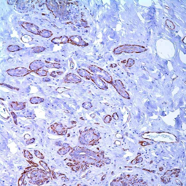 Caldesmon is a regulatory actin-, myosin-, and calmodulin-binding protein involved in smooth muscle contraction. Itis a reliable marker of smooth muscle differentiation,labeling both normal smooth muscle tissue and tumors ofsmooth muscle origin (e.g., leiomyomas, leiomyosarcomas,GISTs). It typically shows immunoreactivity in epithelioidmesothelioma but not in ovarian serous carcinoma, makingit a useful marker in differential diagnosis studies. Inresearch, caldesmon is valuable for studying smoothmuscle biology, tumor classification, and mesothelialversus ovarian tumor distinction.