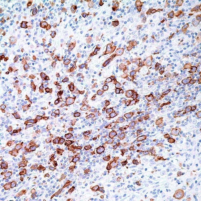 Anti-CD30 identifies a specific part that resists formalin and is present on Reed-Sternberg cells found in typical Hodgkin lymphoma, most anaplastic large cell lymphomas, CD30 positive T-cell disorders that primarily affect the skin, and also in embryonal carcinomas. Sometimes, diffuse large B-cell lymphoma can be marked using this antibody. Additionally, this antibody highlights plasma cells within tissue preserved in paraffin, along with reactive immunoblasts. The way anti-CD30 stains lymphoma differs from how it stains embryonal carcinoma; in lymphoma, the staining occurs in the membrane and shows a stronger color in the Golgi area, while in embryonal carcinoma, only the membrane shows staining.
