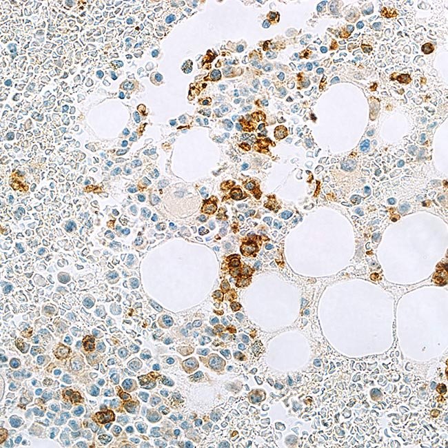 Myocytes, basal keratinocytes, hepatocytes,spermatocytes, endocrine pancreas, placentalsyncytiotrophoblasts, and erythroid precursors all expresstransferrin receptor 1 (CD71). During the intermediatenormoblast phase, transferrin receptor expression peaks inearly erythroid precursors, and then declines during thereticulocyte phase. Erythrocyte maturation causes theexpression of the transferrin receptor to decrease. Whendetecting erythroid precursors, anti-CD71 is helpful.Because erythroid precursors have a large amount oftransferrin receptor, anti-CD71 is a great marker forassessing erythroid precursors in bone marrow biopsyspecimens. It exhibits the following characteristics: Thebone marrow biopsy specimens exhibit 1) a distinctmembranous and cytoplasmic staining pattern that is easilyrecognised; 2) restriction to erythroid lineage; 3) adecrease in CD71 expression as erythrocytes mature, withthe highest level observed in early forms and the lowestlevel in late normoblast stage; and, most significantly, 4)mature erythrocytes do not express CD71.