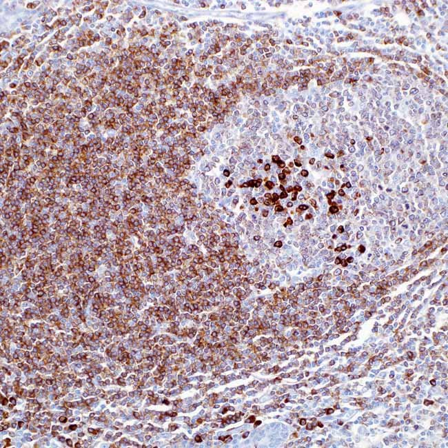 Mb-1 (or CD79a) and B29 (or CD79b) polypeptides form adisulphide-linked heterodimer that is non-covalentlycoupled to membrane-bound immunoglobulins on B cells.The B cell Ag receptor is made up of immunoglobulin andthe polypeptide complexes mb-1 and B29. Early inmaturation, CD79a first manifests as a pre-B cell. Itcontinues to exist as an intracellular component until theplasma cell stage. Most acute leukaemias of the progenitorB cell type, B cell lines, B cell lymphomas, and certainmyelomas have CD79a. Neither myeloid nor T cell lineshave it. Following treatment with Rituximab (anti-CD20),anti-CD79a is typically used to supplement anti-CD20,particularly for mature B-cell lymphomas. This antibody ismore likely to stain B-lymphoblastic lymphoma/leukemiathan anti-CD20, but it will also stain many of the samelymphomas as anti-CD20. Additionally, anti-CD79a stainsmore cases of plasma cell myeloma and, on occasion, someendothelial cell types.