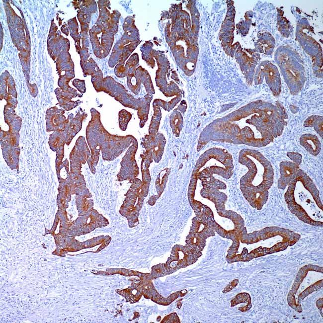 Cytokeratin 20 is a 46-kDa intermediate filament protein that interacts predominantly with Merkel cells, urothelium, and gastric and intestinal epithelium. Under normal, hyperplastic, and neoplastic circumstances, anti-Cytokeratin 20 is helpful in identifying particular types of these epithelial cells.3 Cytokeratin 20 has been discovered in a variety of adenocarcinomas, including those of the colon and stomach. There has been reactivity in Merkel cell carcinomas. Breast tumors, in contrast, are usually non-reactive.