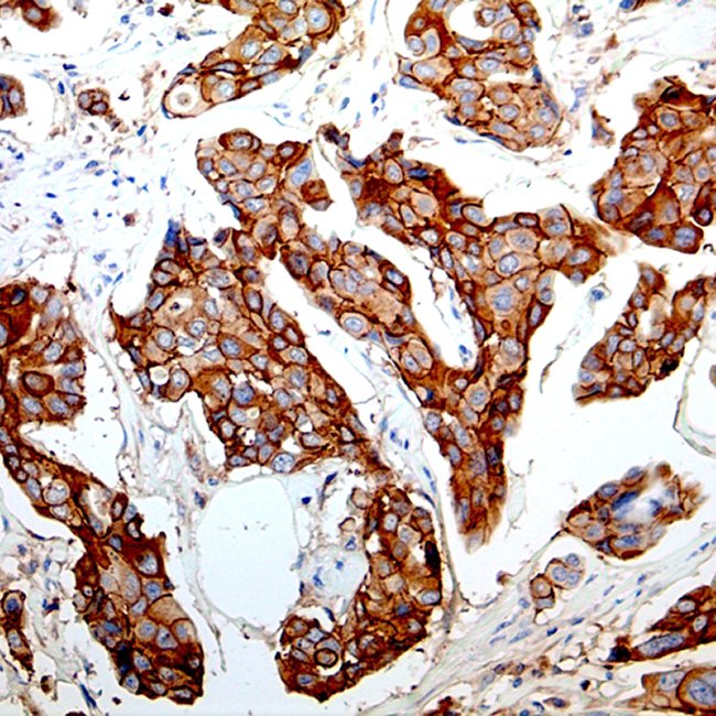 Transmembrane glycoprotein E-Cadherin (EP6) is essentialfor cell adhesion, especially in epithelial tissues. It belongsto the cadherin family, which strengthens cell-to-cellinteractions by forming adherens junctions. In certainmalignancies, such as breast and esophageal cancer, loss ordownregulation of E-Cadherin is linked to enhanced cancercell motility, metastasis, and a poor prognosis.Transmembrane proteins belong to the class of cadherins.By guaranteeing that cells within tissues are bondedtogether, they play a crucial part in cell adhesion. Cells ofthe epithelial lineage exhibit the adhesion protein E-Cadherin. It has positive staining in glandular epithelium,ovarian, lung, and gastrointestinal tract adenocarcinomas.E-Cadherin has proven helpful in differentiating betweenmesothelioma and adenocarcinoma. Additionally, it hasbeen demonstrated to be positive in certain thyroidcancers. It can be utilised to distinguish between LobularBreast Carcinomas and Ductal Carcinomas (which testpositive for E-Cadherin). The development and metastasisof cancer have been linked to the loss of E-Cadherinantibody expression. Cellular motility increases when E-Cadherin is downregulated because it weakens cellularadhesion within tissue. Cancer cells may then be able topenetrate the basement membrane and spread to nearbytissues as a result.