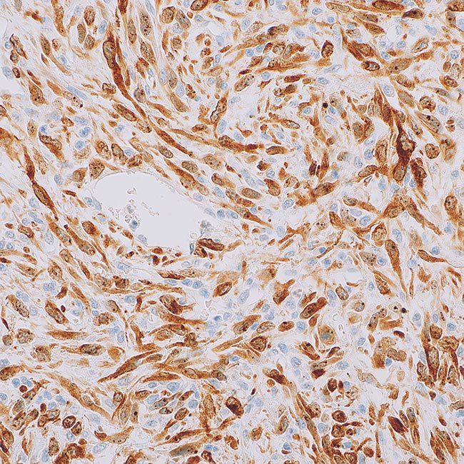 The gene encoding mouse double minute protein 2(MDM2) is located on the 12q13-14 chromosome. 1–5 Itproduces a protein with 483 amino acids that attaches itselfto the p53’s amino-terminal transcription region. Byblocking p53 transcription, binding to p53 and causing it tobe exported from the nucleus, and speeding up p53degradation, 2,5 MDM2 has been demonstrated toadversely influence the tumor-suppressor activity of p53. 1Liposarcoma has been found to have up-regulated MDM2,whereas lipoma does not. 2,4 Anti-MDM2 has thus beenshown to be a potentially helpful tool in differentiatingbetween lipoma and well-differentiated liposarcoma(atypical lipomatous tumour), with the neoplastic cellsbeing negative in lipoma and positive in the former lesion.