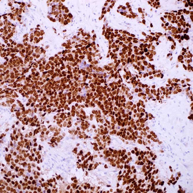 NKX3.1 is a homeobox gene regulated by androgens and specific to the prostate, found on chromosome 8p. Its expression can be detected in both healthy and cancerous prostate tissues. NKX3.1 serves as a reliable tissue marker that assists in the detection of prostate adenocarcinoma.