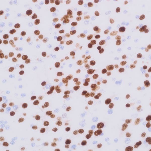 Olig2, a basic helix-loop-helix transcription factor, plays a role in the specification of oligodendroglia. Reports indicate that Olig2 is expressed in the majority of glial tumors, including oligodendrogliomas and astrocytomas. While over fifty percent of glioblastomas exhibit Olig2 positivity, the expression remains quite low regarding both the number of labeled cells and the intensity of the staining. Olig2 has not been detected in non-glial tumors such as neuroepithelial tumors, ependymomas, subependymomas, medulloblastomas, and non-neuroepithelial tumors like CNS lymphomas, meningiomas, schwannomas, atypical teratoid/rhabdoid tumors, and haemangioblastomas. In contrast to the pronounced staining found in glioma samples, non-tumoral brain tissue (gliosis) shows only weak expression.