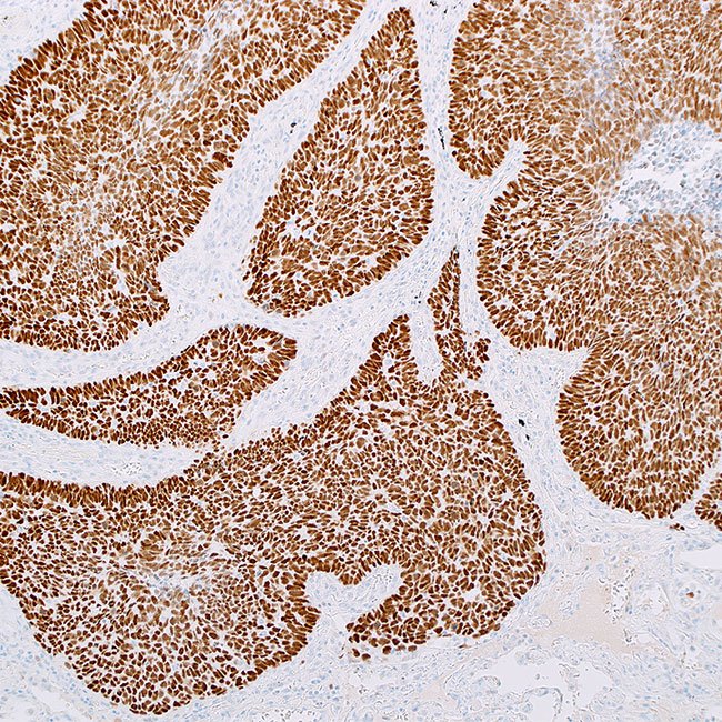 The antibody for the anti-p53 tumor suppressor protein detects a 53 kDa phosphoprotein, known as the product of the p53 suppressor gene. It interacts with both the wild type and mutant versions of p53, but the test using the IHC method relies on the notable buildup of the mutant p53 protein, which has a longer half-life.1 This antibody has demonstrated nuclear staining in breast cancer, lung cancer, colorectal cancer, and urothelial cancer.