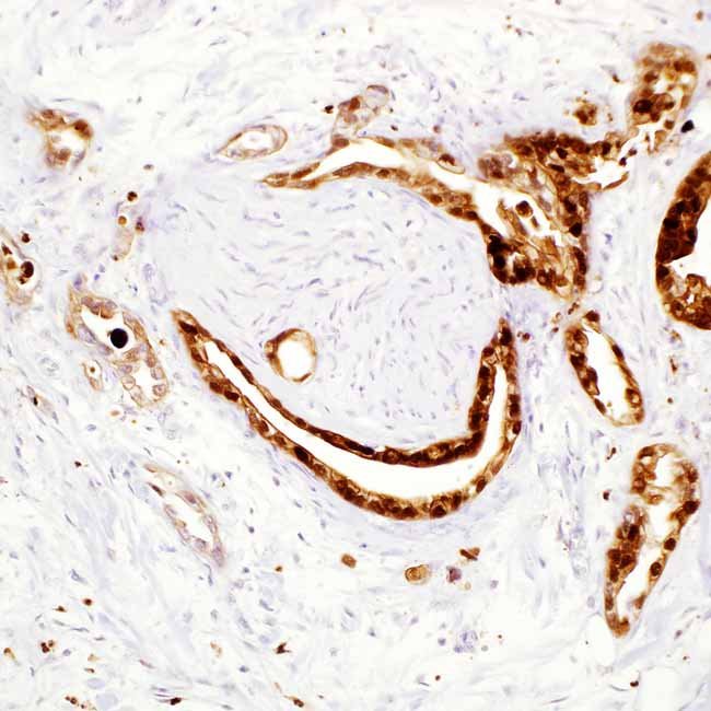 S100P belongs to the S100 protein family. This family is found in various cell types and is believed to be involved in the processes of cell cycle progression and differentiation. The presence of anti-S100P with nuclear or nuclear/cytoplasmic immunoreactivity is observed in pancreatic ductal adenocarcinomas, whereas it is infrequently found in benign pancreatic ducts. Additionally, it may assist in differentiating urothelial carcinomas from other genitourinary neoplasms, including prostate carcinoma.
