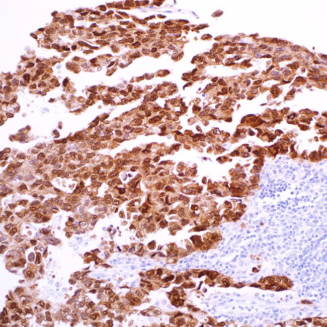 Distinguishing seminomas from non-seminomatous germ cell tumors can be difficult, particularly when dealing with small biopsy samples, necrotic tumors, and metastatic tumors that show artifacts. A particular group of germ cell tumors might need immunohistochemistry (IHC) for proper classification due to atypical morphological traits, like the widespread growth of clear cells and tumors exhibiting glandular or microcytic patterns. In a mixed germ cell tumor, one part frequently intertwines closely with others, like embryonal carcinoma and yolk sac tumor, potentially going unnoticed. IHC can pinpoint such regions, allowing more precise identification of each component within the mixed tumor, and the WHO recommends recording them in pathology reports. Recent IHC research has indicated that the combination of CD30 and CD117 staining is effective in differentiating between embryonal carcinoma and yolk sac tumor. Nevertheless, some tumors may not be easily distinguished using this pair of markers. Furthermore, the typical membranous pattern created by antibodies to CD30 and CD117 used for diagnostic interpretations may not appear clearly in small biopsy samples. In this regard, transcription factors, such as SOX-2, are simpler to interpret because of their distinct nuclear reactions. SOX-2 has been identified as a diagnostic marker for embryonal carcinoma. In fact, SOX-2 was found in all cases of intratubular embryonal carcinoma, pure embryonal carcinoma, and in the embryonal carcinoma portion of mixed germ cell tumors. However, SOX-2 expression has generally not been observed in seminomas, yolk sac tumors, or choriocarcinomas. Including transcription factors like SOX-2 and SOX-17 in an IHC panel aids in the classification of germ cell tumors: specifically, SOX-2+/OCT3/4+/CD30+/CD117-/SOX17- indicates embryonal carcinoma; SOX-2-/OCT3/4+/CD30-/CD117+/SOX17+ indicates seminoma; and SOX-2-/OCT3/4-/CD30-/CD117-/SOX17- indicates yolk sac tumor.