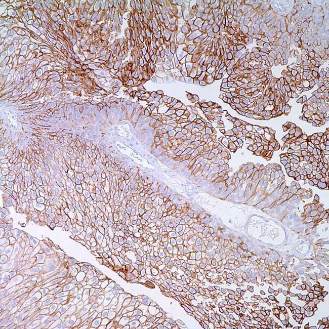 Thrombomodulin is a glycoprotein that spans cell membranes and consists of 575 amino acids (with a molecular weight of 75 kD), known for its natural ability to prevent blood clotting. Typically, it is produced by a limited range of cells, including endothelial and mesothelial cells. Moreover, it is also found in the synovial lining and syncytiotrophoblasts within the human placenta. Anti-thrombomodulin has shown positive results in non-cancerous vascular tumors like hemangiomas, as well as in many cancerous ones, including Kaposi’s sarcoma and epitheloid hemangioendothelioma. Consequently, anti-thrombomodulin is an effective indicator for lymphatic endothelial cells and associated tumors. Recently, there has been growing interest in utilizing anti-thrombomodulin as an immunohistochemical marker for mesothelial cells and malignant mesotheliomas. Additionally, anti-thrombomodulin is also immunoexpressed in an array of other tumors, encompassing urothelial cell carcinomas.