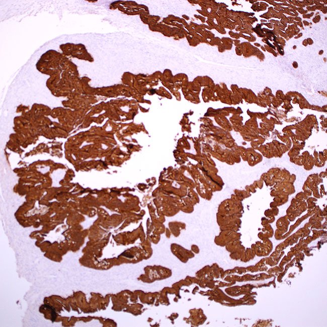 Villin is a glycoprotein weighing 95 kD that is linked to the structure of microvilli found in the epithelial lining of the gastrointestinal tract. Anti-villin identifies the brush border region within the gastrointestinal mucosal epithelium.1 This specific antibody has proven helpful in distinguishing between gastrointestinal adenocarcinomas, neuroendocrine cancers, and ovarian adenocarcinomas, as opposed to adenocarcinomas originating from various other organs. Additionally, this antibody marks the Merkel cells present in the skin.